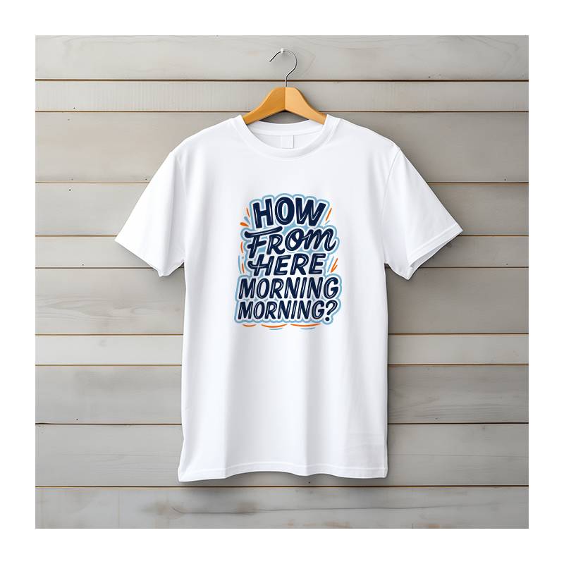 Unisex white t-shirt with the message "How From Here Morning Morning".